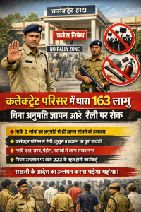 हरदा: जिले में कानून एवं शांति व्यवस्था बनाए रखने के उद्देश्य से कलेक्टर एवं जिला दंडाधिकारी सिद्धार्थ जैन ने भारतीय नागरिक सुरक्षा संहिता 2023 की धारा 163 के तहत हरदा कलेक्ट्रेट परिसर में तत्काल प्रभाव से प्रतिबंधात्मक आदेश जारी किए हैं। यह आदेश एक पक्षीय रूप से लागू किया गया है और आगामी आदेश तक प्रभावशील रहेगा।