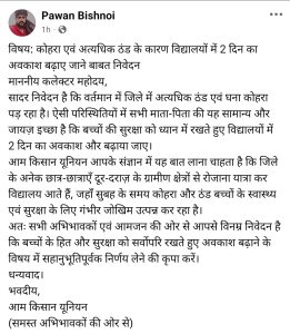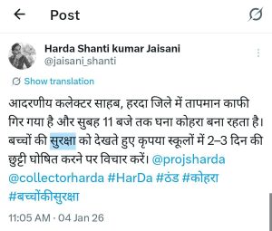 गौरतलब है कि पिछले कुछ दिनों से हरदा जिले में ठंड का प्रकोप लगातार बढ़ रहा था। सुबह और शाम के समय शीत लहर के कारण छोटे बच्चों को स्कूल जाने में भारी परेशानी का सामना करना पड़ रहा था। इसे लेकर पालकों एवं समाजसेवियों ने बच्चों की सुरक्षा को दृष्टिगत रखते हुए जिला प्रशासन से स्कूल समय में परिवर्तन अथवा अवकाश घोषित करने की मांग उठाई थी। यह मांग सोशल मीडिया प्लेटफॉर्म पर भी प्रमुखता से सामने आई, जहां बड़ी संख्या में लोगों ने बच्चों के स्वास्थ्य को लेकर चिंता जताई।